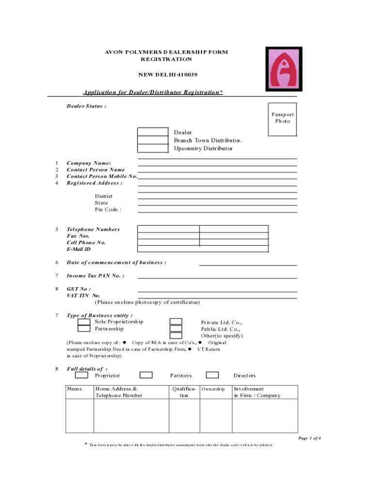 AVON POLYMERS DEALERSHIP FORM REGISTRATION NEW DELHI110039 Application for Dealer/Distributor Registration* Dealer Status : Passport Photometer Branch Town Distributor. Upcountry Distributor 1 2 3