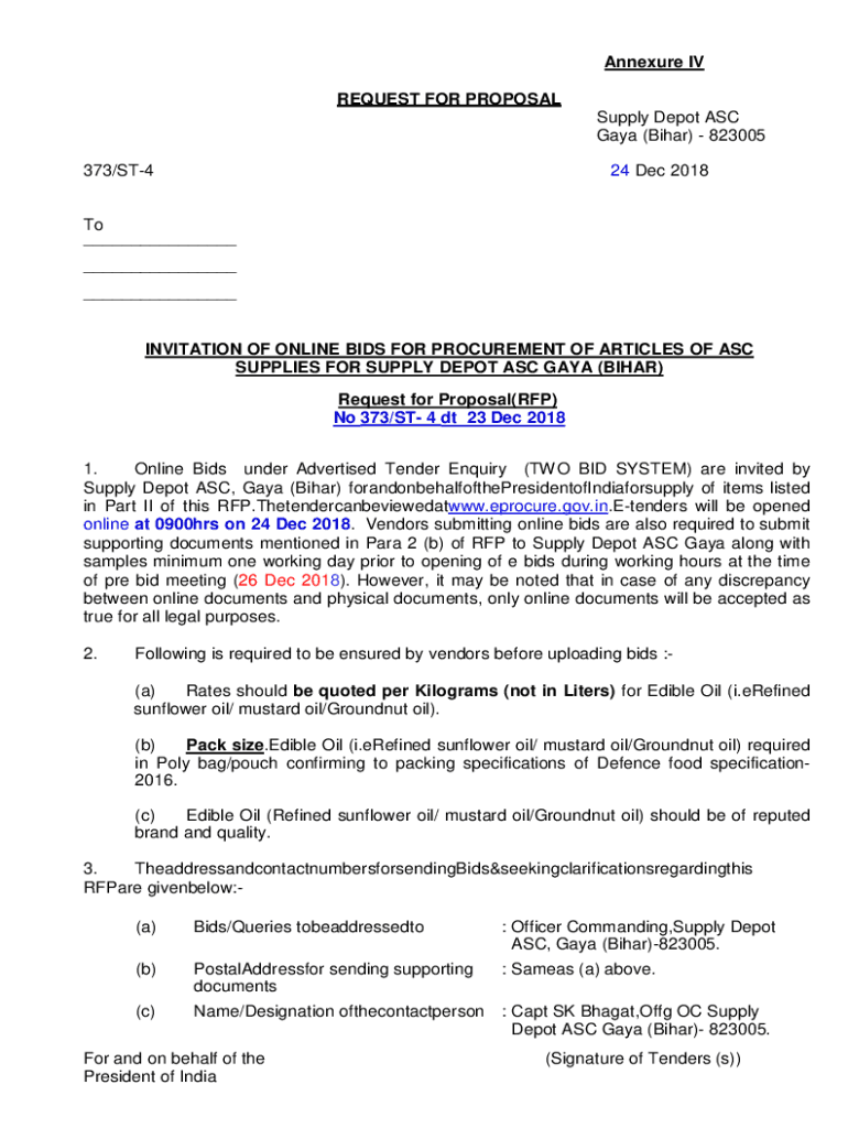 Appendix IV REQUEST FOR PROPOSAL Supply Depot ASC Maya (Bihar) 823005 24 Dec 2018373/ST4 To ___ ___ ___INVITATION OF ONLINE BIDS FOR PROCUREMENT OF ARTICLES OF ASC SUPPLIES FOR SUPPLY DEPOT ASC MAYA