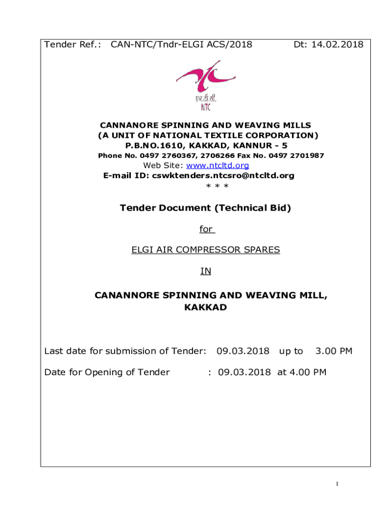 Tender Ref.:CAN NTC/Andrei ACS/2018Dt: 14.02.2018CANNANORE SPINNING AND WEAVING MILLS (A UNIT OF NATIONAL TEXTILE CORPORATION) P.B.NO.1610, AKKAD, KANPUR 5 Phone No. 0497 2760367, 2706266 Fax No.
