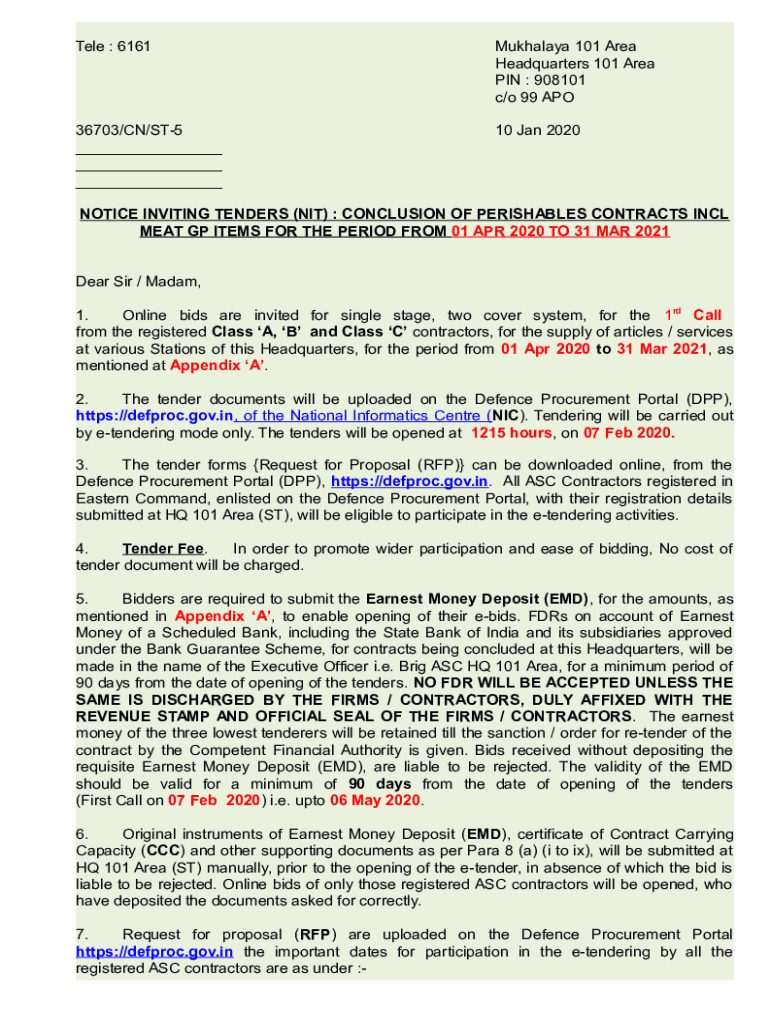 Tell : 6161Mukhalaya 101 Area Headquarters 101 Area PIN : 908101 c/o 99 APO36703/CN/ST5 ___ ___ ___10 Jan 2020NOTICE INVITING TENDERS (NIT) : CONCLUSION OF PERISHABLES CONTRACTS INCL MEAT GP ITEMS