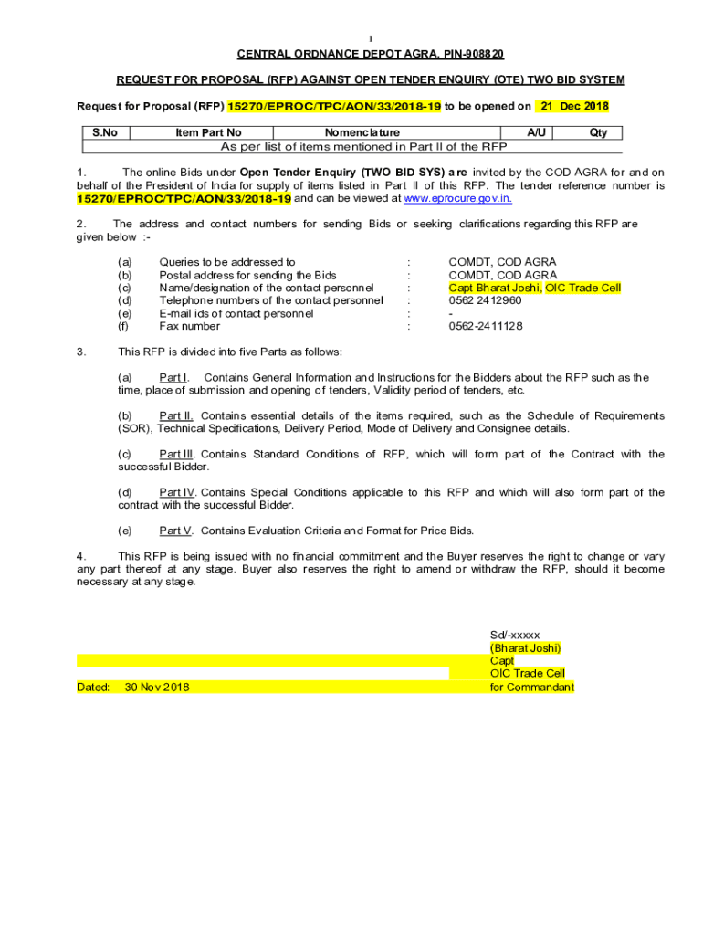 1CENTRAL ORDNANCE DEPOT AGRA, PIN908820 REQUEST FOR PROPOSAL (RFP) AGAINST OPEN TENDER Inquiry (ONE) TWO BID SYSTEM Request for Proposal (RFP) 15270/EPROM/TPC/AON/33/201819 to be opened on 21 Dec