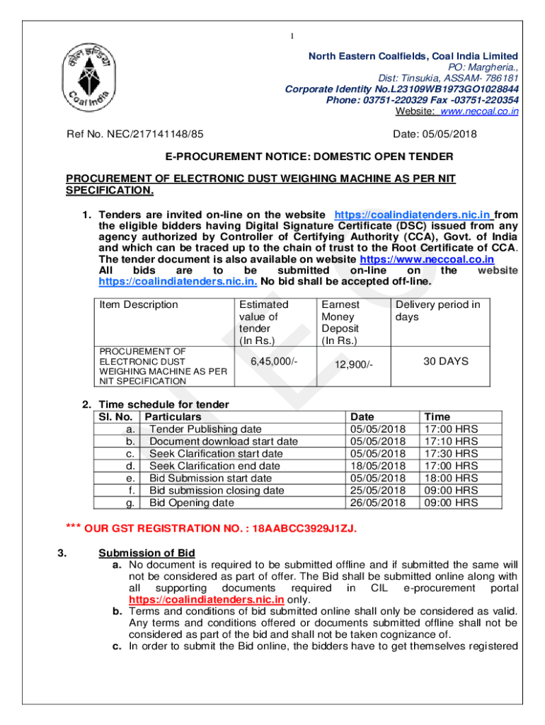 1North Eastern Coalfields, Coal India Limited PO: Margherita., Dist:, ASSAM 786181 Corporate Identity No. L23109WB1973GO1028844 Phone: 03751220329 Fax 03751220354 Website: www.necoal.co.inRef No.