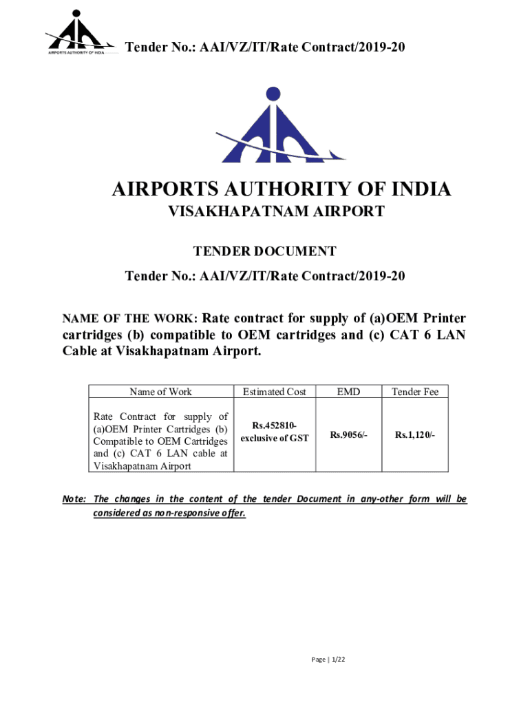 Tender No.: AAI/VS/IT/Rate Contract/201920AIRPORTS AUTHORITY OF INDIA VISAKHAPATNAM AIRPORT TENDER DOCUMENT Tender No.: AAI/VS/IT/Rate Contract/201920 NAME OF THE WORK: Rate contract for supply of