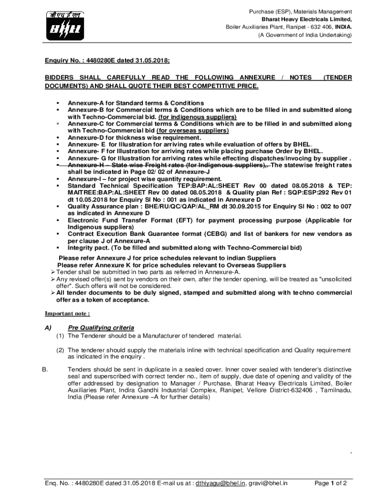 Purchase (ESP), Materials Management Bharat Heavy Electrical Limited, Boiler Auxiliaries Plant, Reinspect 632 406, INDIA. (A Government of India Undertaking)Inquiry No. 4480280E dated 31.05.2018;