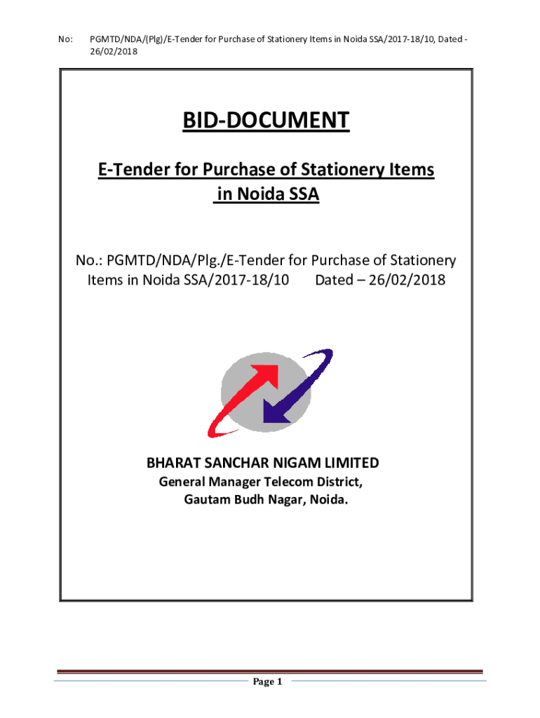 No:PG MTD/NDA/(PLG)/Tender for Purchase of Stationery Items in Noida SSA/201718/10, Dated 26/02/2018BIDDOCUMENT Tender for Purchase of Stationery Items in Noida SSA No.: PG MTD/NDA/PLG./Tender for