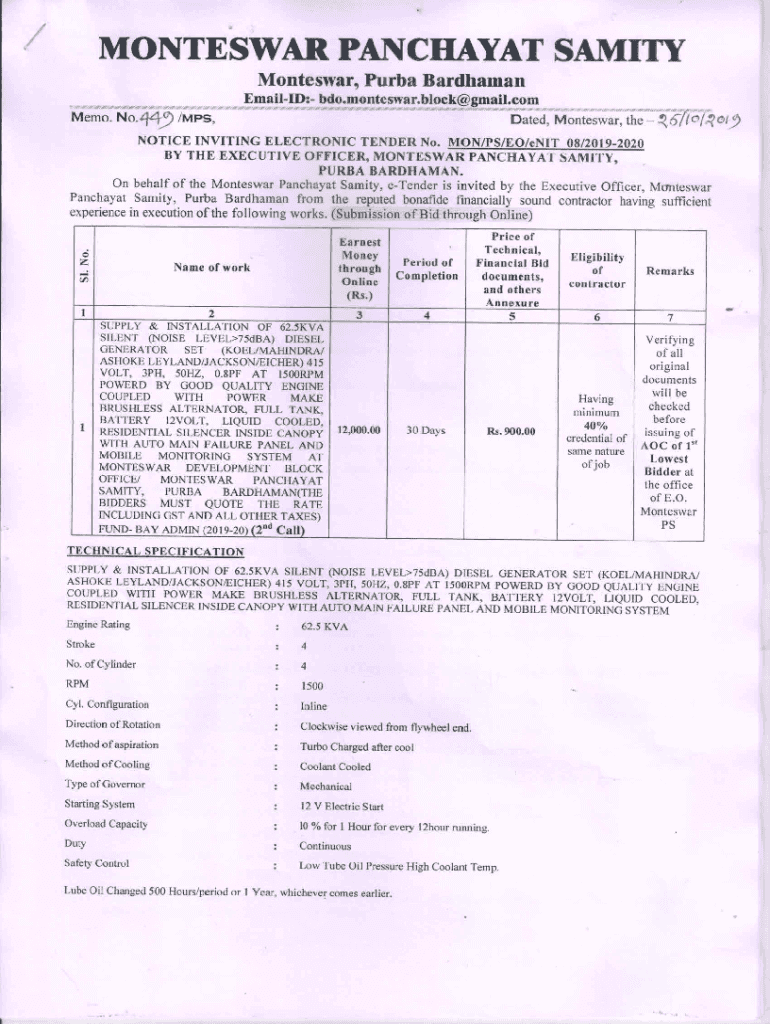 Ref : Tender for (Name of work)ENIT No. MON/PS/EO/ENIT_08/20192020 Executive