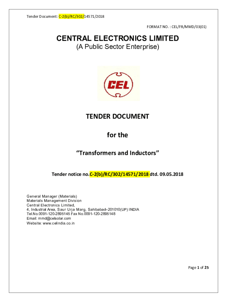 Tender Document: C2(b)/RC/302/14571/2018 FORMAT NO. CEL/FR/MID/03(01)CENTRAL ELECTRONICS LIMITED (A Public Sector Enterprise)TENDER DOCUMENT for the Transformers and Inductors Tender notice no. C2(b)/RC/302/14571/2018