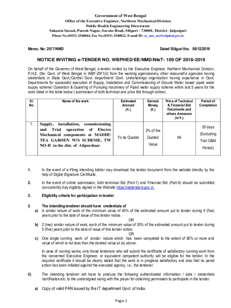 Get the free NOTICE INVITING e-TENDER NO. WBPHED/EE/NMD/NIeT