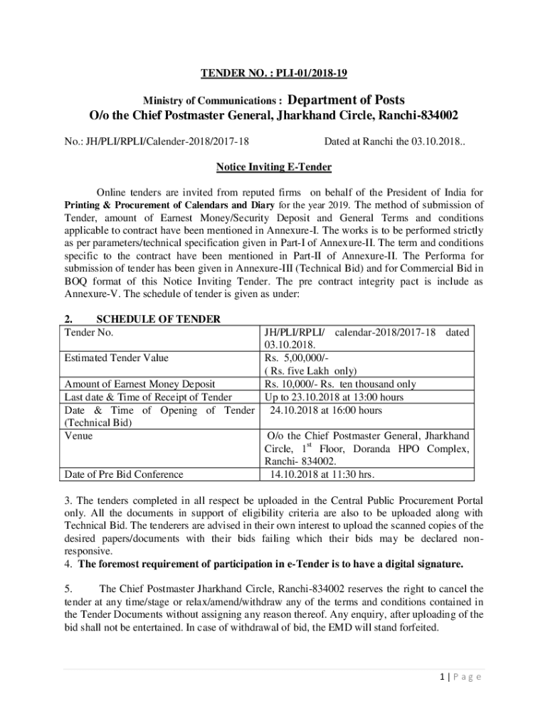 TENDER NO. PLI01/201819 Ministry of Communications :Department of Posts/o the Chief Postmaster General, Jharkhand Circle, Ranchi834002 No.: JR/PCI/RPI/Calender2018/201718Dated at Ranchi the 03.10.2018.