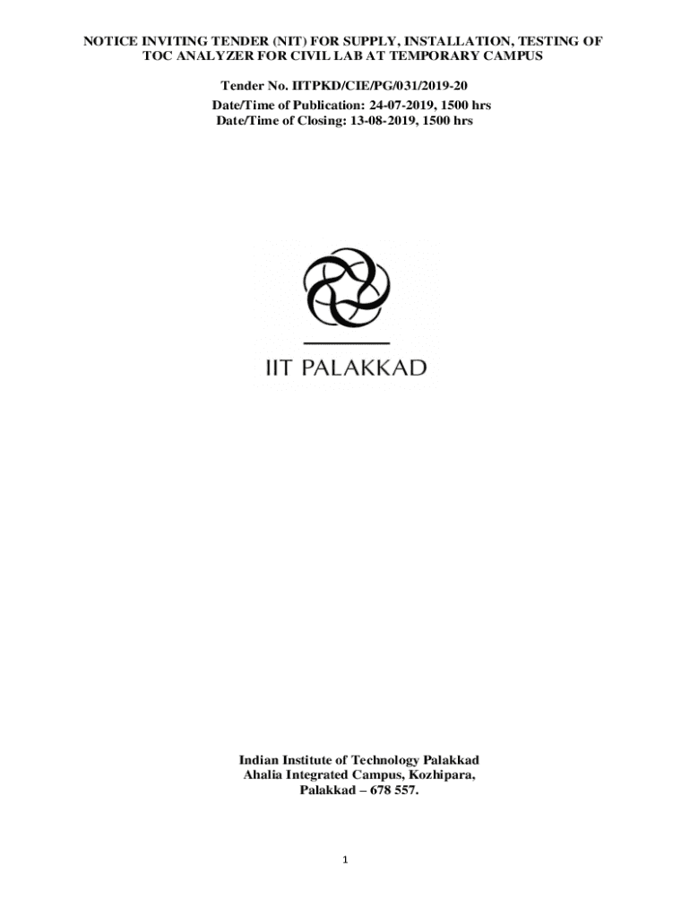 NOTICE INVITING TENDER (NIT) FOR SUPPLY, INSTALLATION, TESTING OF TOC ANALYZER FOR CIVIL LAB AT TEMPORARY CAMPUS Tender No. IIT PKD/CIE/PG/031/201920 Date/Time of Publication: 24072019, 1500 hrs Date/Time
