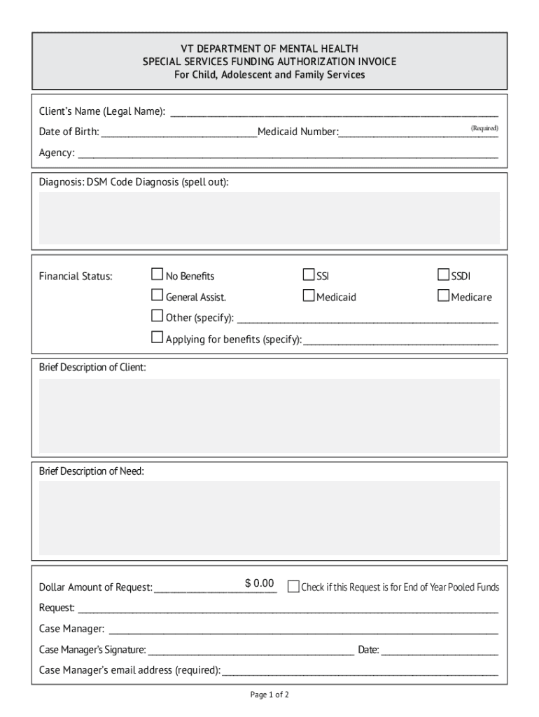 VT DEPARTMENT OF MENTAL HEALTH SPECIAL SERVICES FUNDING AUTHORIZATION INVOICE For Child, Adolescent and Family Services Clients Name (Legal Name): ___ (Required) Date of Birth:___Medicaid Number:___Agency:___