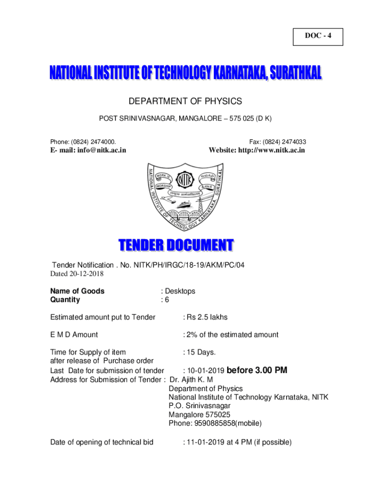 DOC 4DEPARTMENT OF PHYSICS POST SRINIVASNAGAR, MANGALORE 575 025 (D K) Phone: (0824) 2474000. Fax: (0824) 2474033E mail: info@nitk.ac.inWebsite: http://www.nitk.ac.inTender Notification. No. NICK/PH/IGC/1819/AKM/PC/04