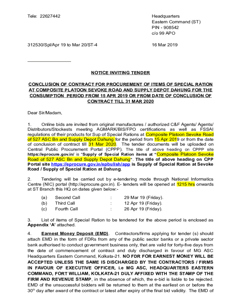 Tell: 22627442Headquarters Eastern Command (ST) PIN 908542 c/o 99 APO312530/SPL/Apr 19 to Mar 20/ST416 Mar 2019___ NOTICE INVITING TENDER CONCLUSION OF CONTRACT FOR PROCUREMENT OF ITEMS OF SPECIAL