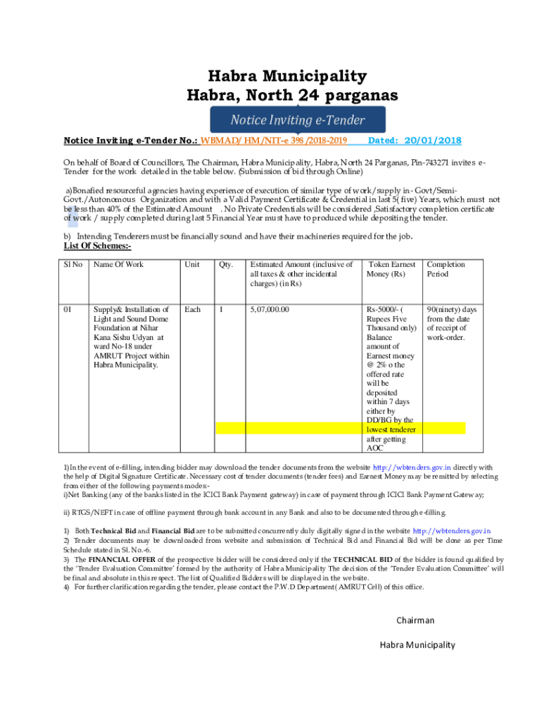Sabra Municipality Sabra, North 24 Marianas Notice Inviting tender Notice Inviting tender No.: WB MAD/ HM /Nice 398 /20182019Dated: 20/01/2018On behalf of Board of Councillors, The Chairman, Sabra