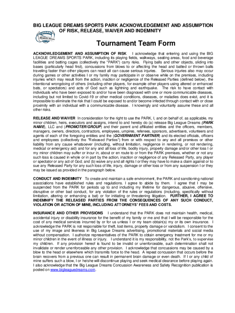 BIG LEAGUE DREAMS SPORTS PARK ACKNOWLEDGEMENT AND ASSUMPTION OF RISK, RELEASE, WAIVER AND INDEMNITYTournament Team Form ACKNOWLEDGEMENT AND ASSUMPTION OF RISK I acknowledge that entering and using