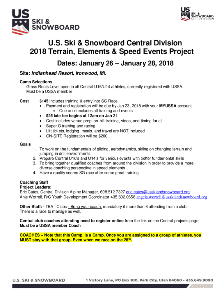 U.S. Ski & Snowboard Central Division 2018 Terrain, Elements & Speed Events Project Dates: January 26 January 28, 2018, Site: Indian head Resort, Ironwood, Mi. Camp Selections Grass Roots Level open