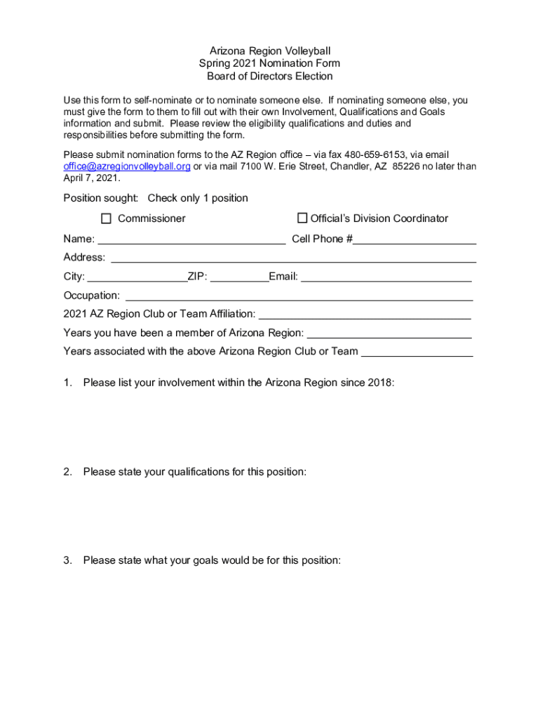 Arizona Region Volleyball Spring 2021 Nomination Form Board of Directors Election Use this form to self nominate or to nominate someone else. If nominating someone else, you must give the form to