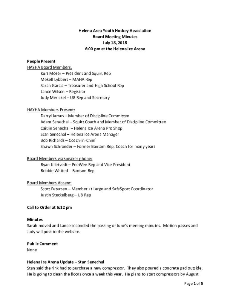 Helena Area Youth Hockey Association Board Meeting Minutes July 18, 2018 6:00 pm at the Helena Ice Arena People Present HA YHA Board Members: Kurt Moses President and Squirt Rep Merely Lambert MAYA