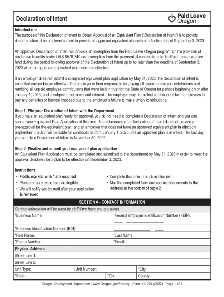 Declaration of Intent Introduction: The purpose of this Declaration of Intent to Obtain Approval of an Equivalent Plan (Declaration of Intent) is to provide documentation of an employers intent to