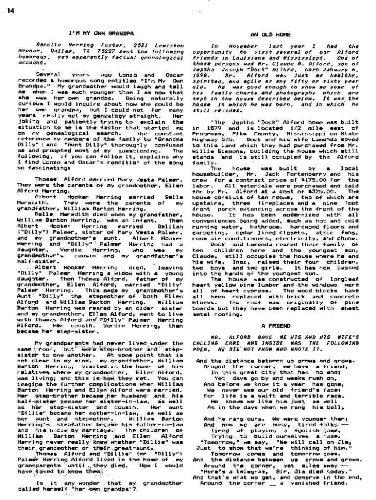 14I\'M MY OWN GRANDPAAN OLD HOMERanelle Herring Foster, 2531 LeNiston Rvenue, Dallas, TX 75227 sent the folloNing hu.orous, yet apparently factual genealogical account. Several years ago Lonzo and