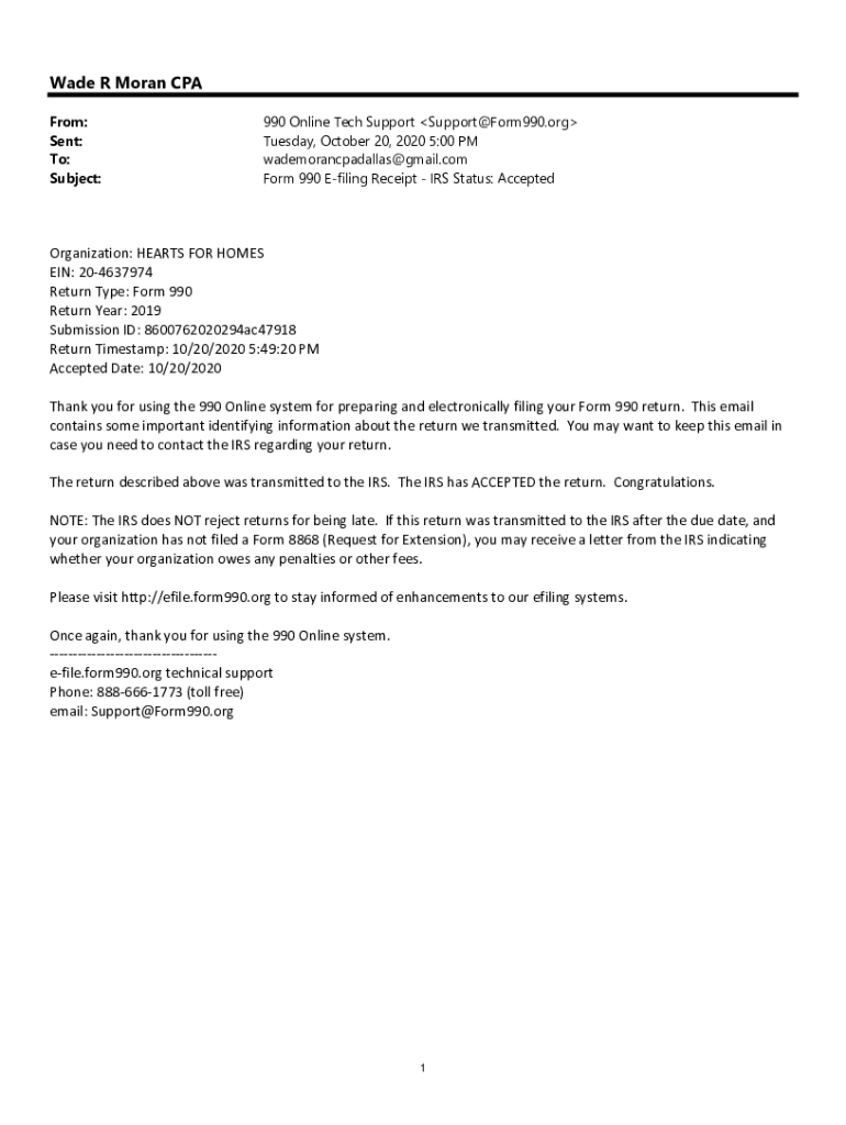 Wade R Moran CPA From: Sent: To: Subject:990 Online Tech Support Support@Form990.org Tuesday, October 20, 2020 5:00 PM wademorancpadallas@gmail.com Form 990 Filing Receipt IRS Status: Accepted Organization:HEARTSFORHOMES