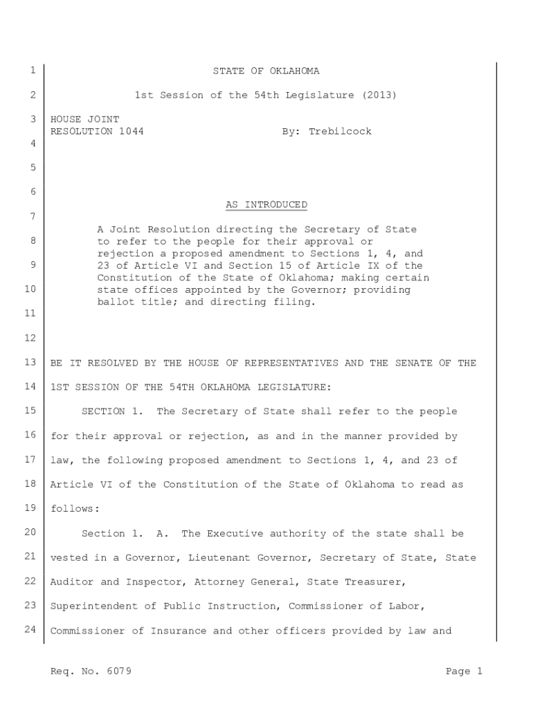 1STATE OF OKLAHOMA21st Session of the 54th Legislature (2013)3HOUSE JOINT RESOLUTION 1044By: Trebilcock4 5 6 AS INTRODUCED7 8 9 10A Joint Resolution directing the Secretary of State to refer to the