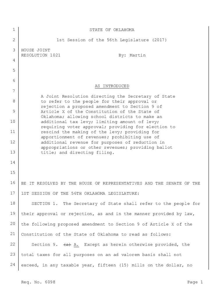 1STATE OF OKLAHOMA21st Session of the 56th Legislature (2017)3HOUSE JOINT RESOLUTION 1021By: Martin4 5 6 AS INTRODUCED7 8 9 10 11 12 13A Joint Resolution directing the Secretary of State to refer