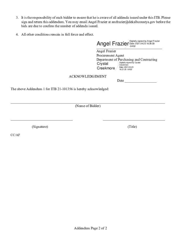 April 23, 2021, TO:All Bidders under Invitation to Bid No. 21101356FROM:Department of Purchasing and Contracting, DeKalb County, Georgia ADDENDUM NO. 1Invitation to Bid (ITB) No. 21101356, SPLOSH
