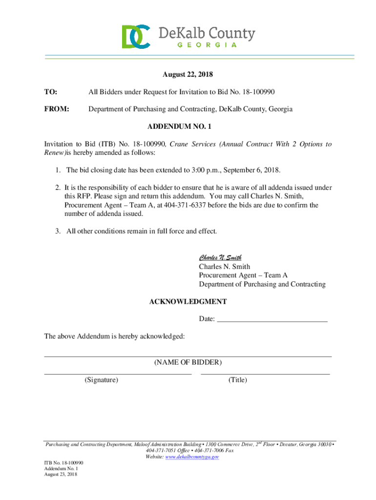 August 22, 2018, TO:All Bidders under Request for Invitation to Bid No. 18100990FROM:Department of Purchasing and Contracting, DeKalb County, Georgia ADDENDUM NO. 1Invitation to Bid (ITB) No. 18100990,