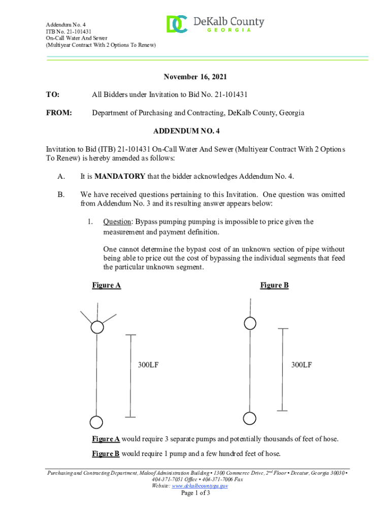 Addendum No. 4 ITB No. 21101431 Call Water And Sewer (Multiyear Contract With 2 Options To Renew)November 16, 2021, TO:All Bidders under Invitation to Bid No. 21101431FROM:Department of Purchasing