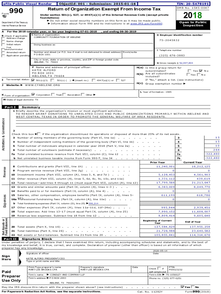 EfilePublicVisualRenderFormObjectId:001Submission:20150116TIN:205478191990A Forthe2018calendaryear,ortaxyearbeginning07012018DEmployeridentificationnumber752045832Namechange