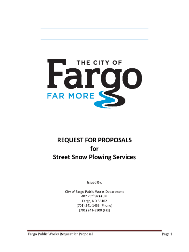 REQUESTFORPROPOSALS for StreetSnowPlowingServices Issued: CityofFargoPublicWorksDepartment 40223rdStreetN. Fargo,ND58102 (701)2411453(Phone) (701)2418100(Fax) Fargo Public Works Request for Proposal