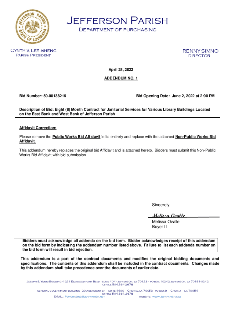 ADDENDUM NO. 1Bid Number: 5000138216Bid Opening Date: June 2, 2022, at 2:00 Description