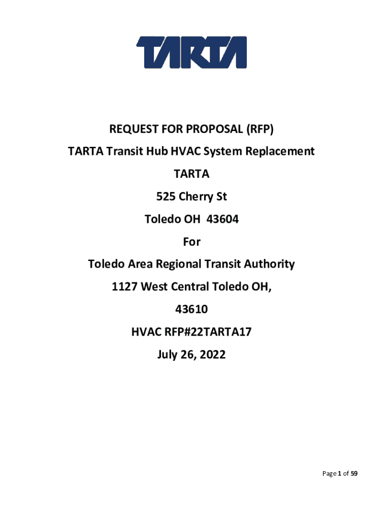 REQUEST FOR PROPOSAL (RFP) MARTA Transit Hub HVAC System Replacement MARTA 525 Cherry St Toledo OH 43604 For Toledo Area Regional Transit Authority 1127 West Central Toledo OH, 43610 HVAC RFP#22TARTA17