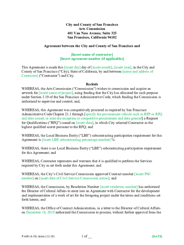 City and County of San Francisco Arts Commission 401 Van Less Avenue, Suite 325 San Francisco, California 94102 Agreement between the City and County of San Francisco and [Insert name of contractor]