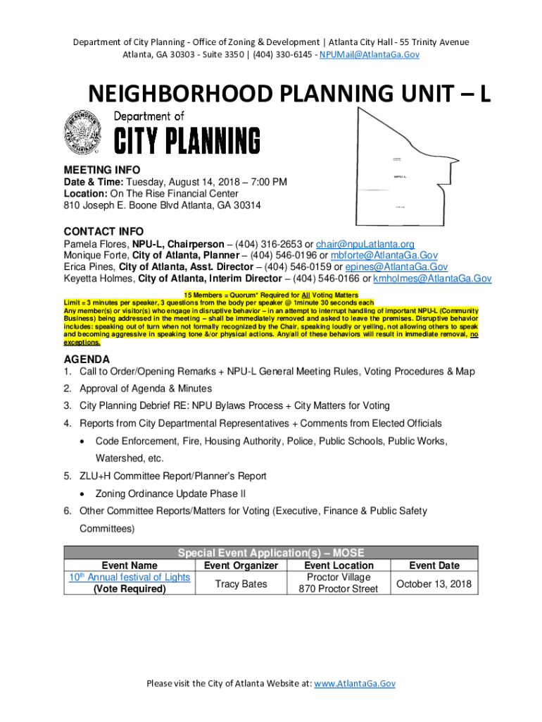 Department of City Planning Office of Zoning & Development | Atlanta City Hall 55 Trinity Avenue Atlanta, GA 30303 Suite 3350 | (404) 3306145 NPUMail@AtlantaGa. Neighborhood PLANNING UNIT L MEETING