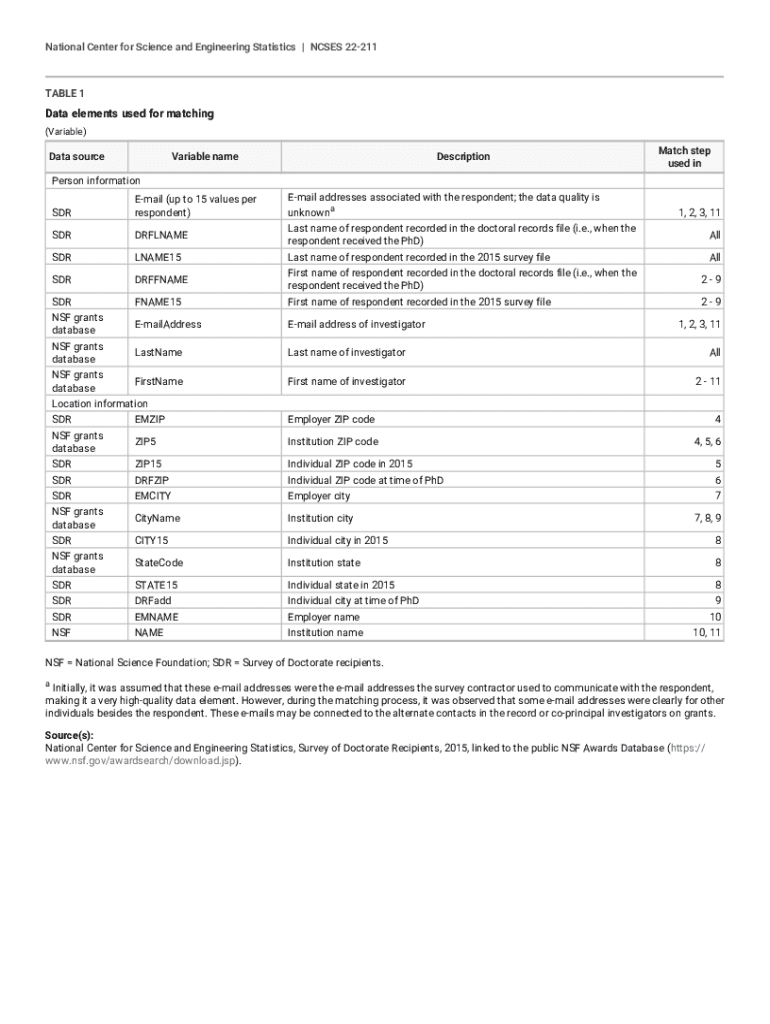 National Center for Science and Engineering Statistics | NOSES 22211TABLE 1Data elements used for matching (Variable)Data sourceVariable nameDescriptionMatch step used unperson information Remain