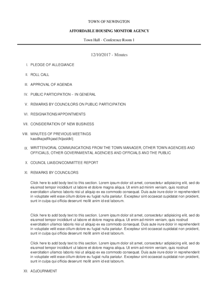 TOWN OF NEWINGTON AFFORDABLE HOUSING MONITOR AGENCY Town Hall Conference Room 112/10/2017 Minutes I. PLEDGE OF ALLEGIANCE II. ROLL CALL III. APPROVAL OF AGENDA IV. PUBLIC PARTICIPATION IN GENERAL
