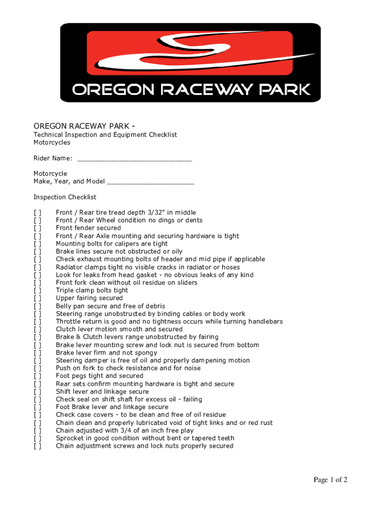 OREGON RACEWAY PARK Technical Inspection and Equipment Checklist Motorcycles Rider Name: ___ Motorcycle Make, Year, and Model ___ Inspection Checklist [[[[[[[[[[[[[[[[[[[[[[[[[[[[[[[]]]]]]]]]]]]]]]]]]]]]]]]]]]]]]]Front