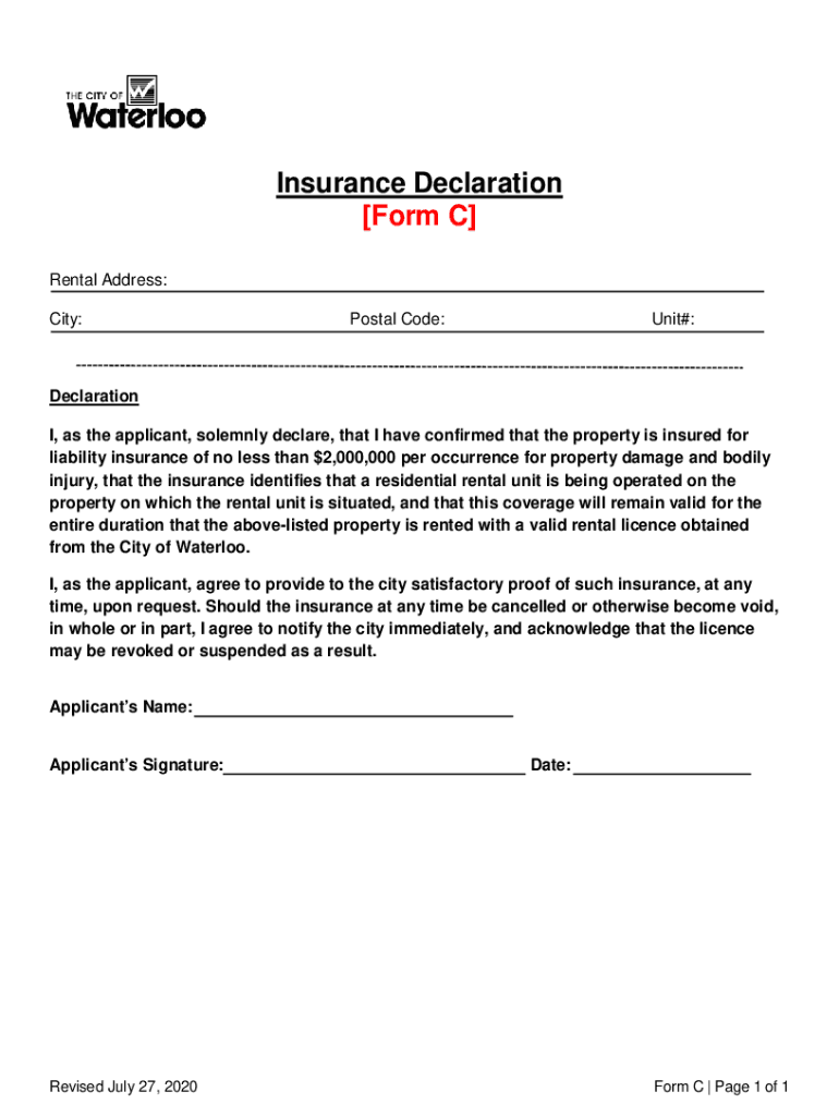 Insurance Declaration [Form C] Rental Address: City:Postal Code:Unit#:Declaration I, as the applicant, solemnly declare, that I have confirmed that the property is insured for liability insurance