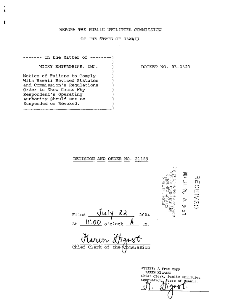 BEFORE THE PUBLIC UTILITIES COMMISSION OF THE STATE OF Hawaiian the Matter of)NICKY ENTERPRISE, INC.DOCKET NO. 030323Notice of Failure to Comply With Hawaii Revised Statutes and Commissions Regulations