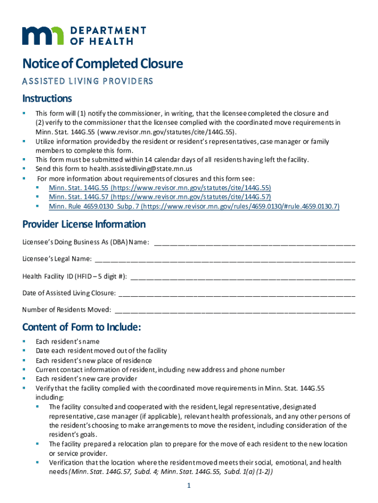 Notice of Completed Closure A S S I S T E D L I V IN G P R O V ID E Instructions This form will (1) notify the commissioner, in writing, that the licensee completed the closure and (2) verify to the