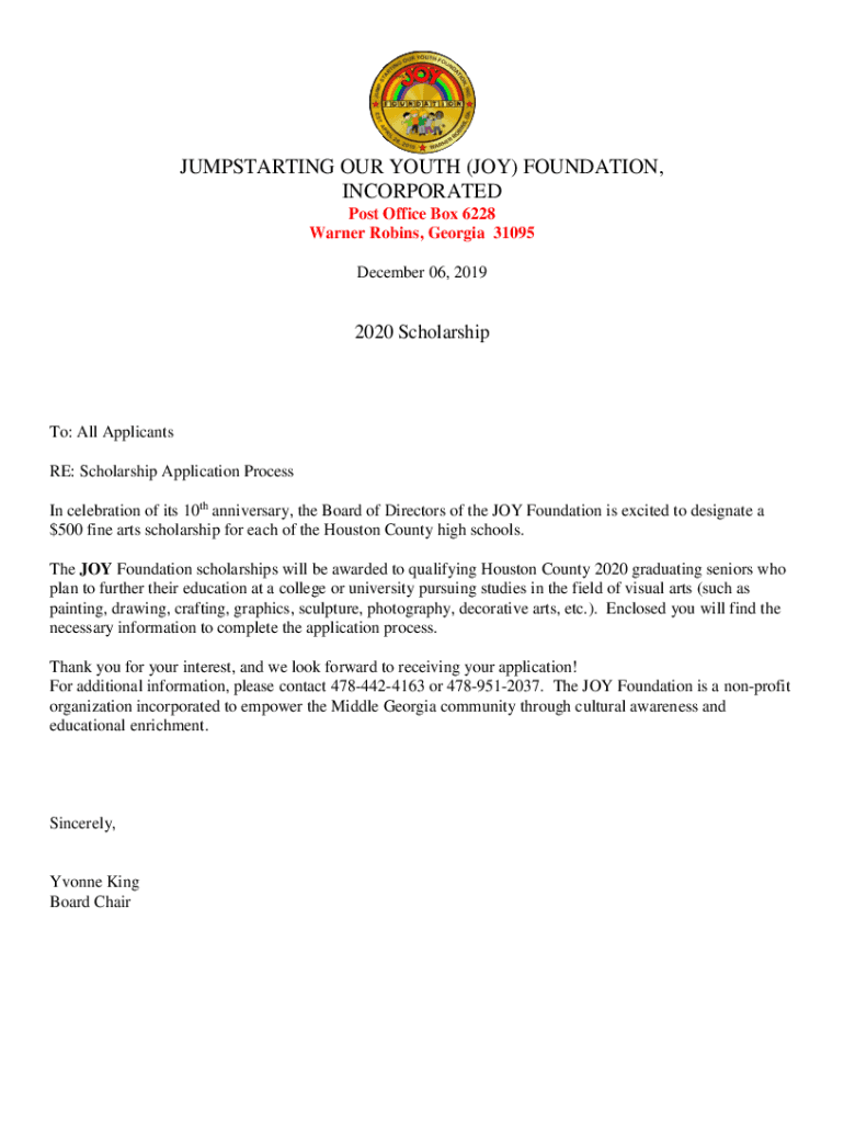 JUMPSTARTING OUR YOUTH (JOY) FOUNDATION, INCORPORATED Post Office Box 6228 Warner Robins, Georgia 31095 December 06, 20192020 Scholarship: All Applicants RE: Scholarship Application Process In celebration