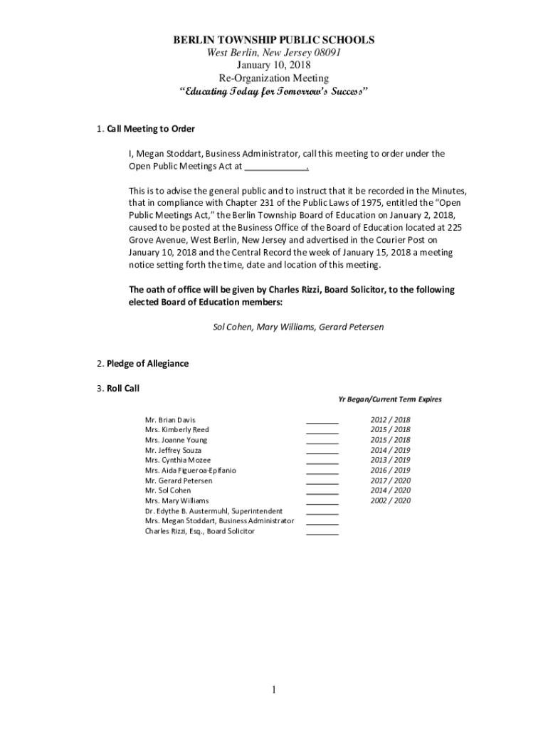 BERLIN TOWNSHIP PUBLIC SCHOOLS West Berlin, New Jersey 08091 January 10, 2018, Reorganization Meeting Educating Today for Tomorrow's Success 1. Call Meeting to Order I, Megan Stoddard, Business Administrator,