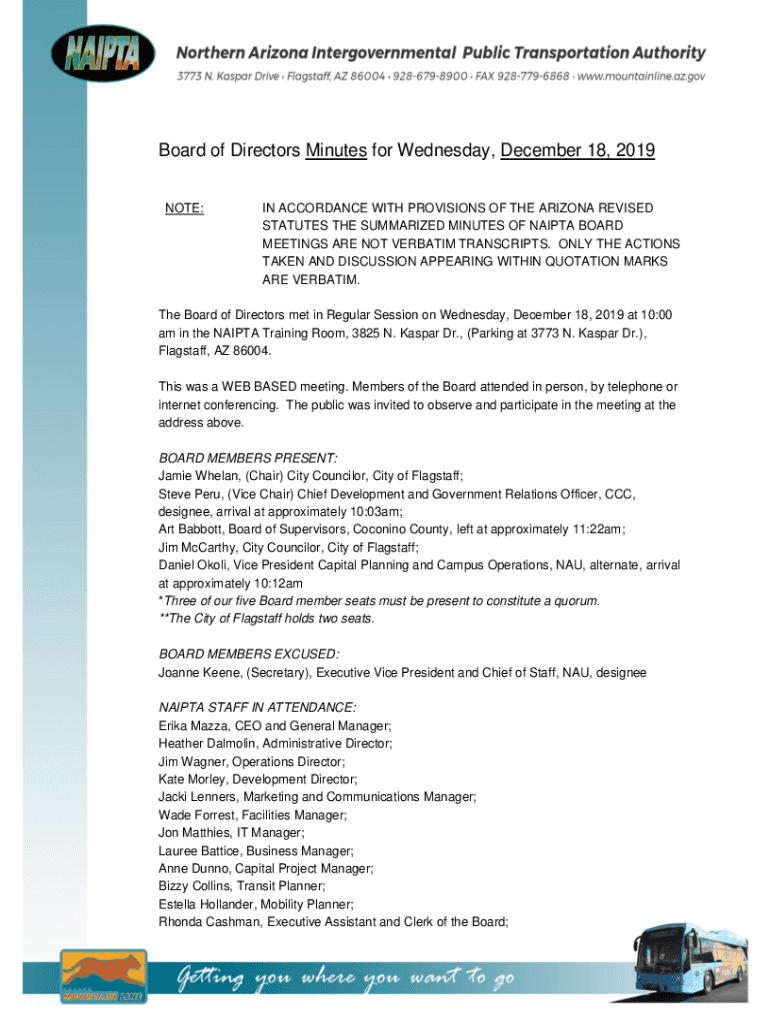 Board of Directors Minutes for Wednesday, December 18, 2019, NOTE:IN ACCORDANCE WITH PROVISIONS OF THE ARIZONA REVISED STATUTES THE SUMMARIZED MINUTES OF NAFTA BOARD MEETINGS ARE NOT VERBATIM TRANSCRIPTS.