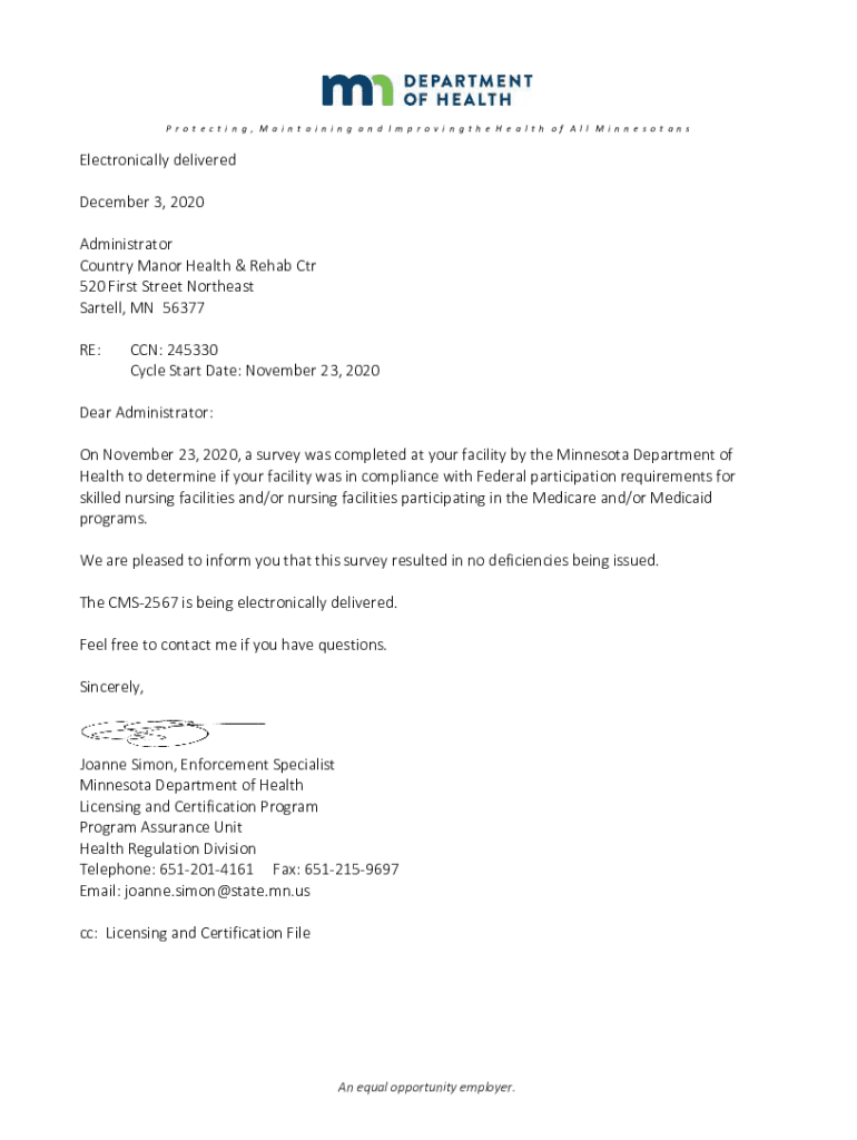 Protecting, MaintainingandImprovingtheHealthofAllMinnesotans Electronically delivered December3,2020 Administrator CountryManorHealth&RehabCtr 520FirstStreetNortheast Cartel,MN56377 RE: CCN:245330