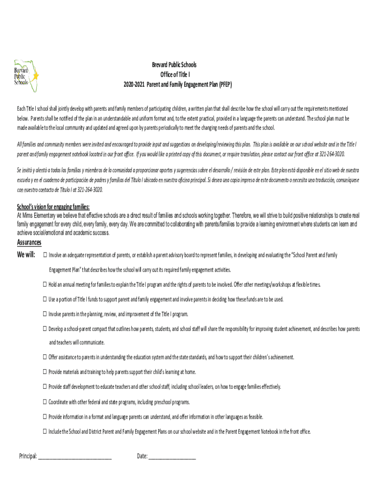 Brevard Public Schools Office of Title I 20202021 Parent and Family Engagement Plan (PREP) Each Title I school shall jointly develop with parents and family members of participating children, a written