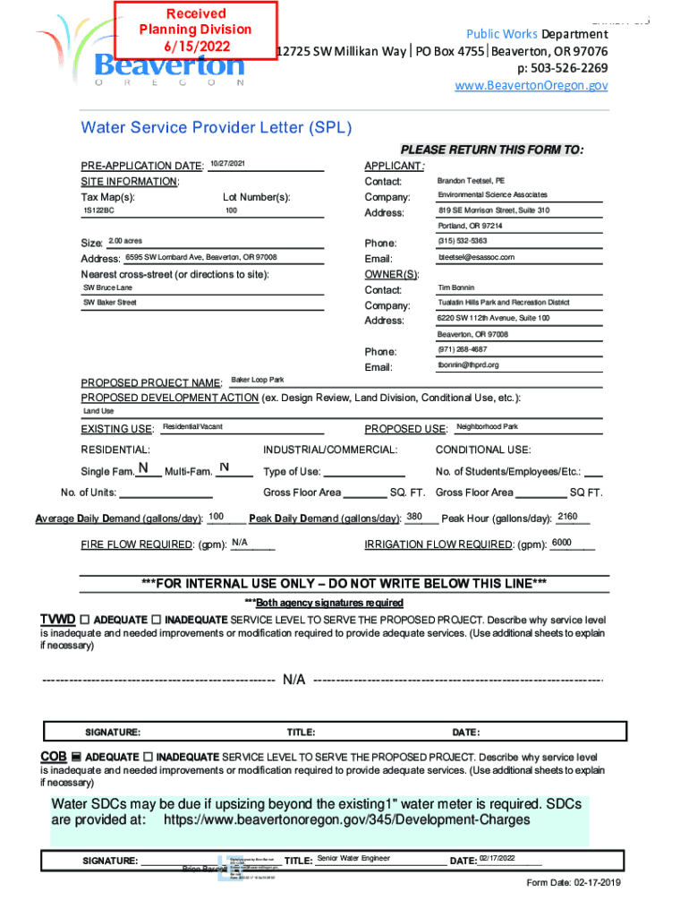 Received Planning Division 6/15/2022EXHIBIT 3.6PublicWorksDepartment 12725SWMillikanWayPOBox4755Beaverton,OR97076 p:5035262269 www.BeavertonOregon.govWater Service Provider Letter (SPL) PLEASE RETURN