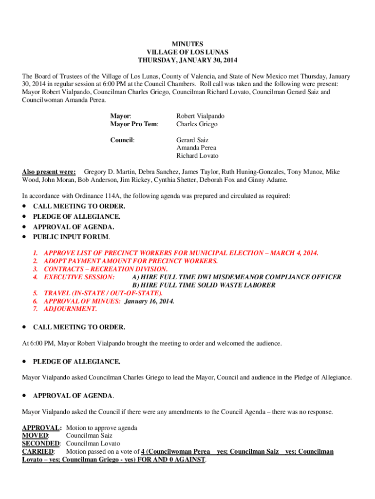 MINUTES VILLAGE OF LOS LUNAR THURSDAY, JANUARY 30, 2014, The Board of Trustees of the Village of Los Luna's, County of Valencia, and State of New Mexico met Thursday, January 30, 2014, in regular