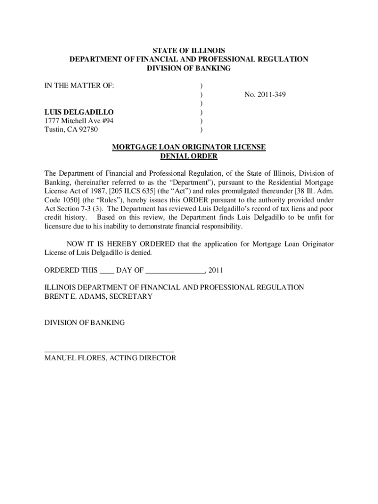 STATE OF ILLINOIS DEPARTMENT OF FINANCIAL AND PROFESSIONAL REGULATION DIVISION OF BANKING IN THE MATTER OF:LUIS DELGADO 1777 Mitchell Ave #94 Austin, CA 92780))))))No. 2011349MORTGAGE LOAN ORIGINATOR